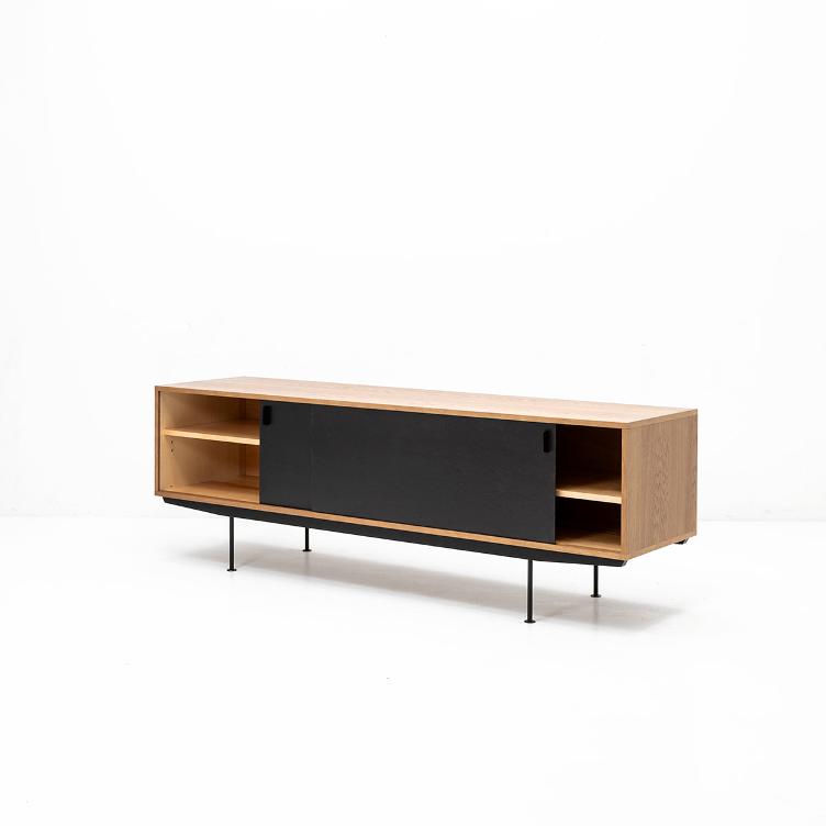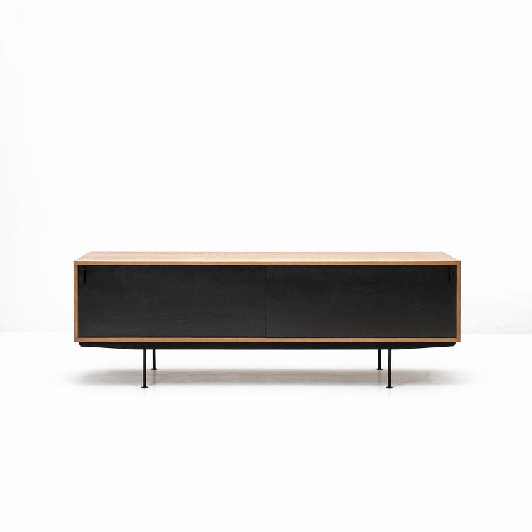 The DW Sesam sideboard is a key early work by Dieter Waeckerlin, dating from 1957. It captivates with its timeless elegance and clean lines. Crafted from high-quality oak and featuring sliding doors and a shelf on each side, it combines aesthetic and functional aspects. This durable piece of furniture offers ample storage space and is a classic of mid-century design.