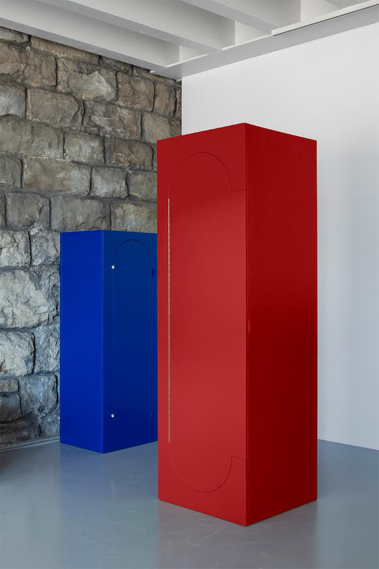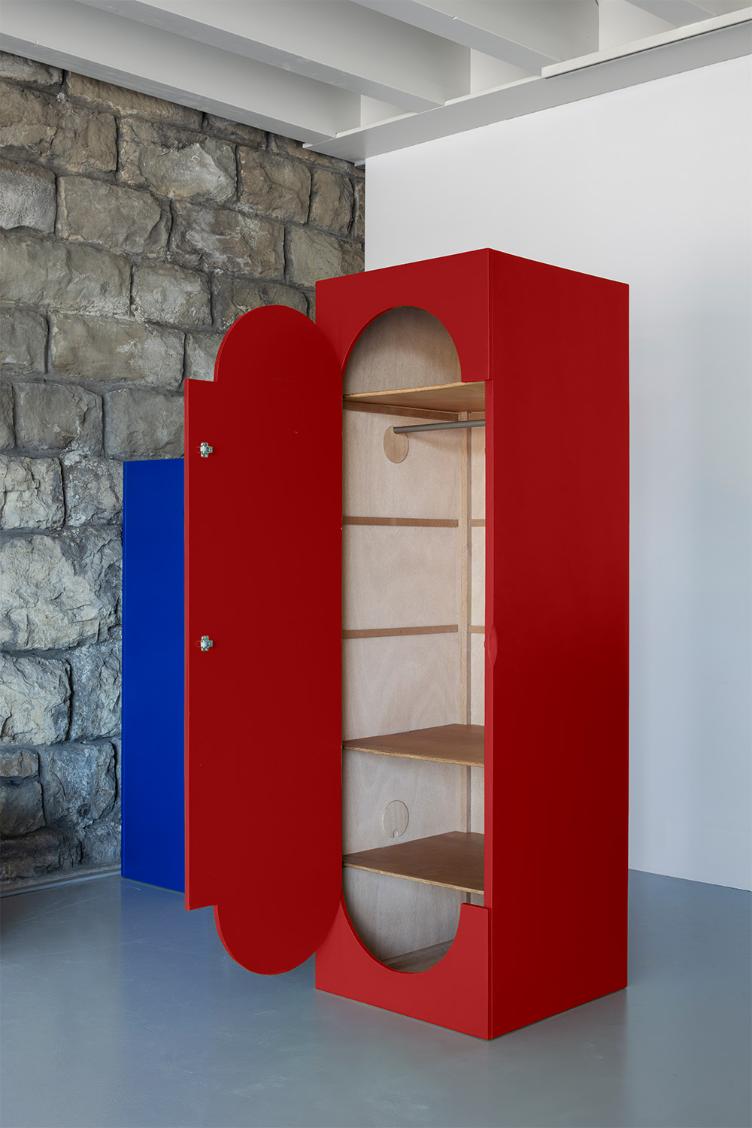 Dans le contexte du mouvement « anti-design », Vogt clouait ensemble des panneaux de contreplaqué standardisés pour former une structure stable, puis découpait les ouvertures à la scie. Cette méthode de fabrication permettait une grande variété de formes libres pour les ouvertures des façades de tiroirs et de meubles. À l`époque, il avait opté pour des charnières piano, qui épousaient parfaitement les contours des découpes.
