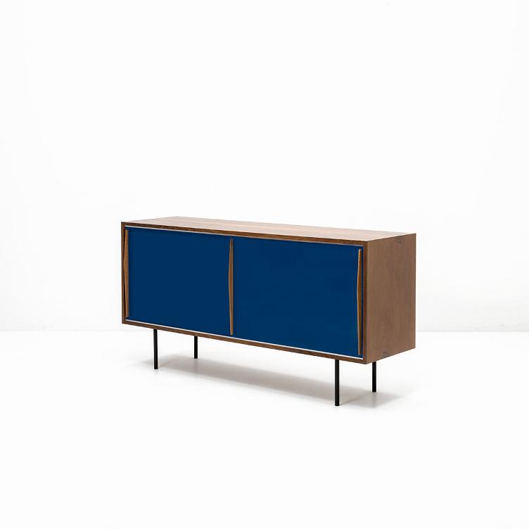 La credenza è dotata di due scomparti di pari dimensioni, ciascuno dotato di un ripiano. Questi possono essere posizionati individualmente all`altezza desiderata su entrambi i lati. Offrendo ampio spazio di contenimento, questo mobile senza tempo è un classico del design di metà secolo.