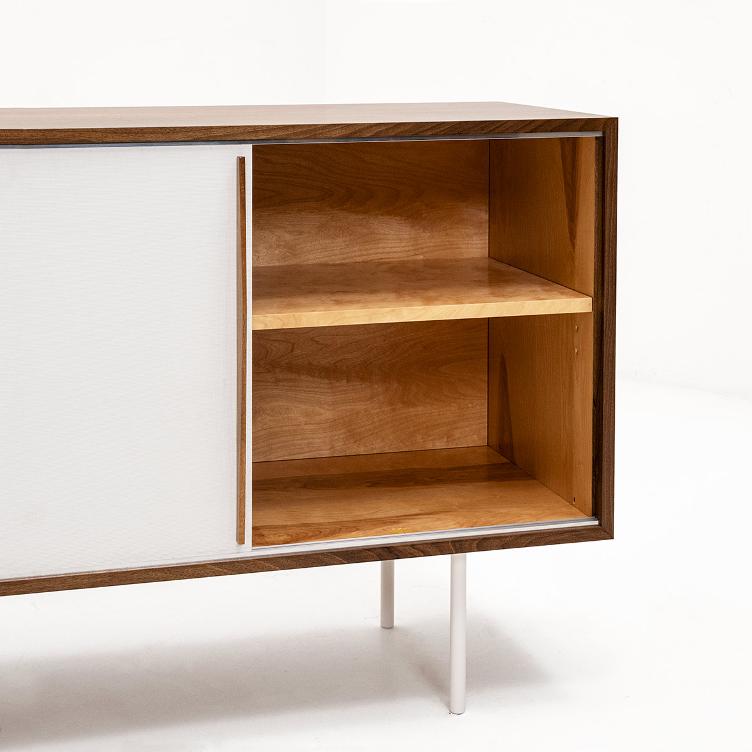 La credenza modello S943, minimalista e funzionale, fu progettata da Kurt Thut nel 1953. La sua costruzione e il suo design si basavano sui principi architettonici moderni, applicati all`architettura di Ludwig Mies van der Rohe. La credenza, che contribuì al successo dei mobili Thut, simboleggia il passaggio dalla falegnameria tradizionale a un oggetto di design moderno e funzionale.
