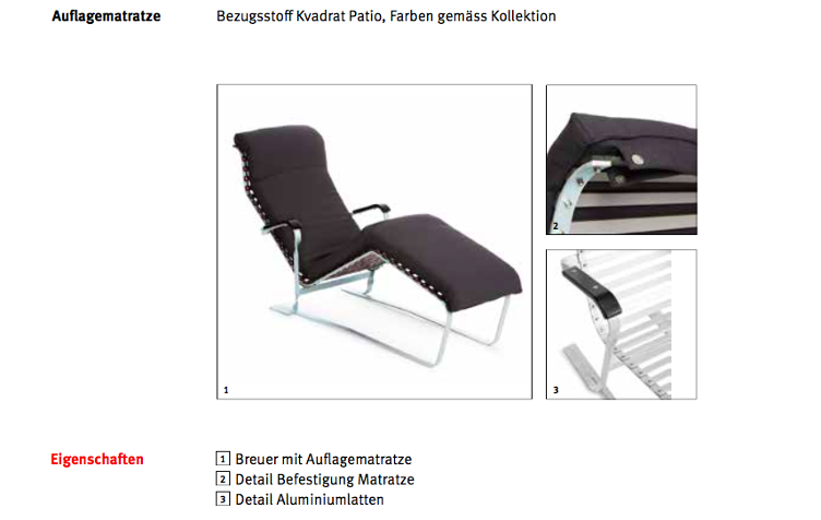Im Jahre 1933 entwickelte Marcel Breuer mit Embru eine Reihe von Stühlen, Sesseln und Liegestühlen aus Flachstahl und Aluminiumprofilen. Heute stellt Embru die Liege Modell 1096 aus feuerverzinktem Flachstahl wieder her. Die mit dem Untergestell verschraubten Latten bestehen aus geschliffenem und farblos eloxiertem Aluminium.