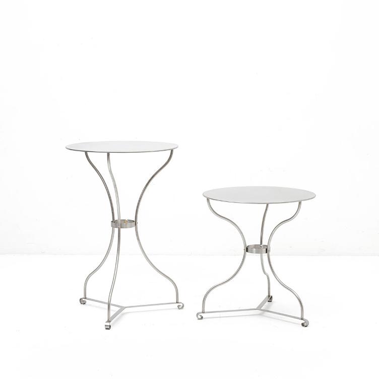 Klassische Gartentisch von Bogen33 & Partner. Tischplatte Edelstahl unlackiert. Als Lounge- oder Bistrovariante verfügbar.