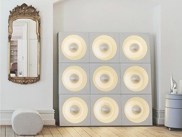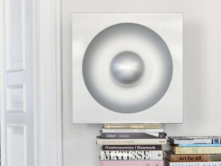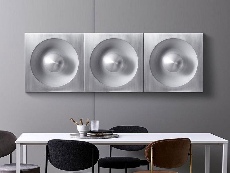 Heute wie eh und je erfreut sich die avantgardistische Leuchte aus gebürstetem Aluminium grosser Beliebtheit. Die extravagante Lampe hat die Form eines Vintage Lautsprechers kann sowohl an der Wand als auch an der Decke montiert werden. Mehrere Spiegel Lampen zusammen ergeben attraktive Licht-Paneele für spektakuläre Innenräume.