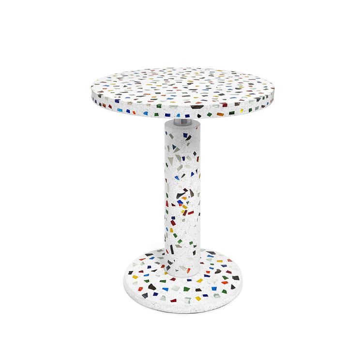 Verchromtes Metall und weisses Granito (Zement mit eingearbeiteten Stücken aus buntem Glas)