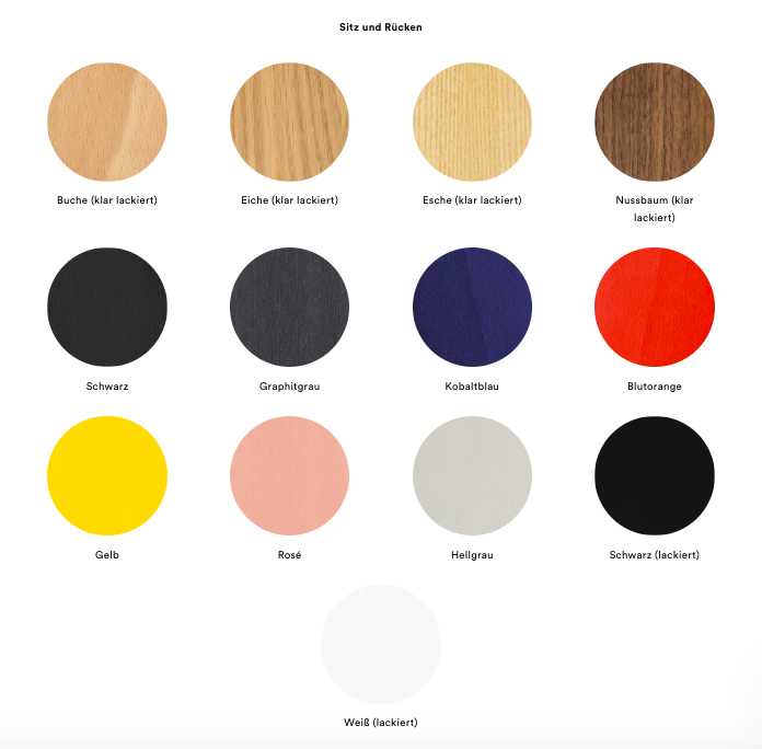 Geformter Sitz und Rücken aus mehrfach verleimtem Echtholzfurnier in Buche, Eiche, Nussbaum Natur oder Buche farbig gebeizt oder lackiert