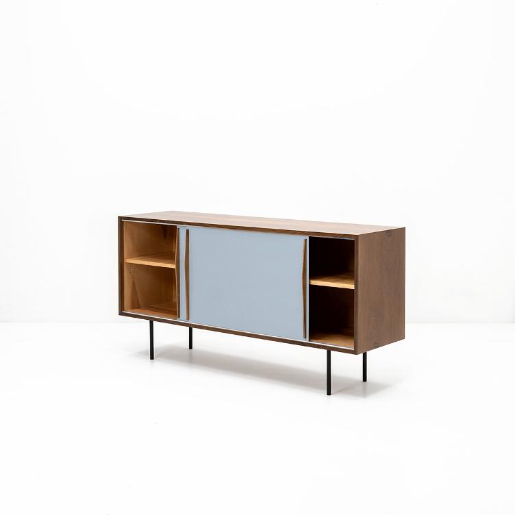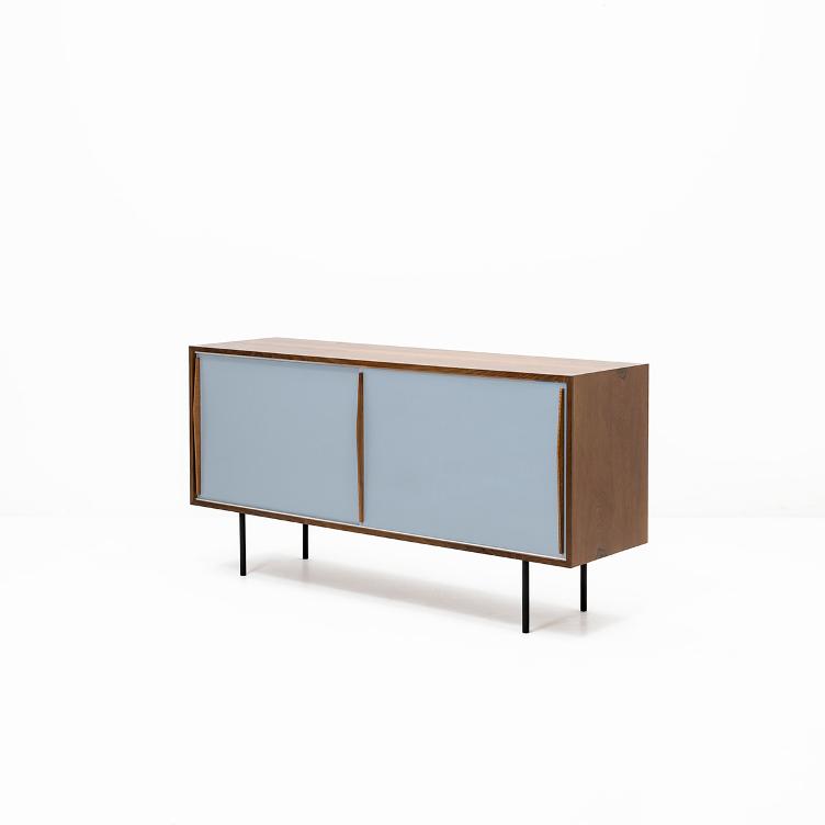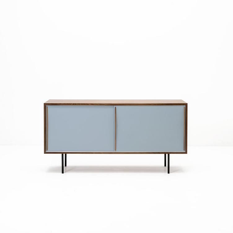 Produkt:  Kurt Thut Sideboard S943 Nussbaum | Spezialausführung hellgrau Marke:  SwissFurniture (Schweiz) Designer:  Kurt Thut (Schweiz) Masse:  B160cm × H80cm × T45cm Nr.:  7033 Lieferzeit:  6 - 7 Wochen